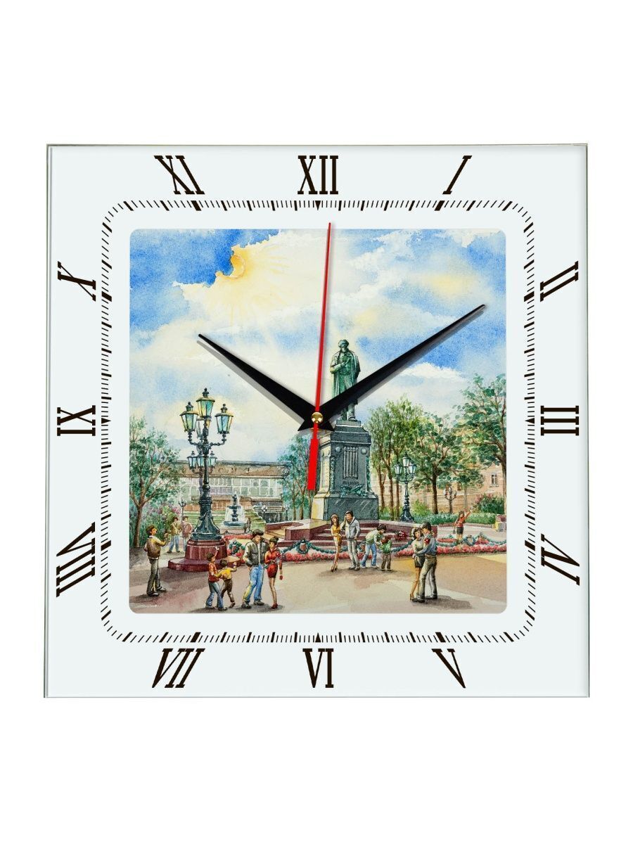 Часы сувенир "Московский сквер" размер часов 28х28 см, стекло 4 мм, изображение печатаем ULTRA HD качества. Оно нанесено с обратной стороны. Стекло дает глубокий оптический эффект и защиту от выгорания ярких цветов. Механизм кварцевый с плавным ходом работает от пальчиковой батарейки АА. Стекло закалено и покрыто с обратной стороны защитной пленкой для защиты изображения и для безопасности. Упаковка из белого гофрокартона с дополнительными элементами для сохранности стеклянного циферблата. Размер упаковки: 0,3х0,3х0,04 м , масса 0,8 кг.