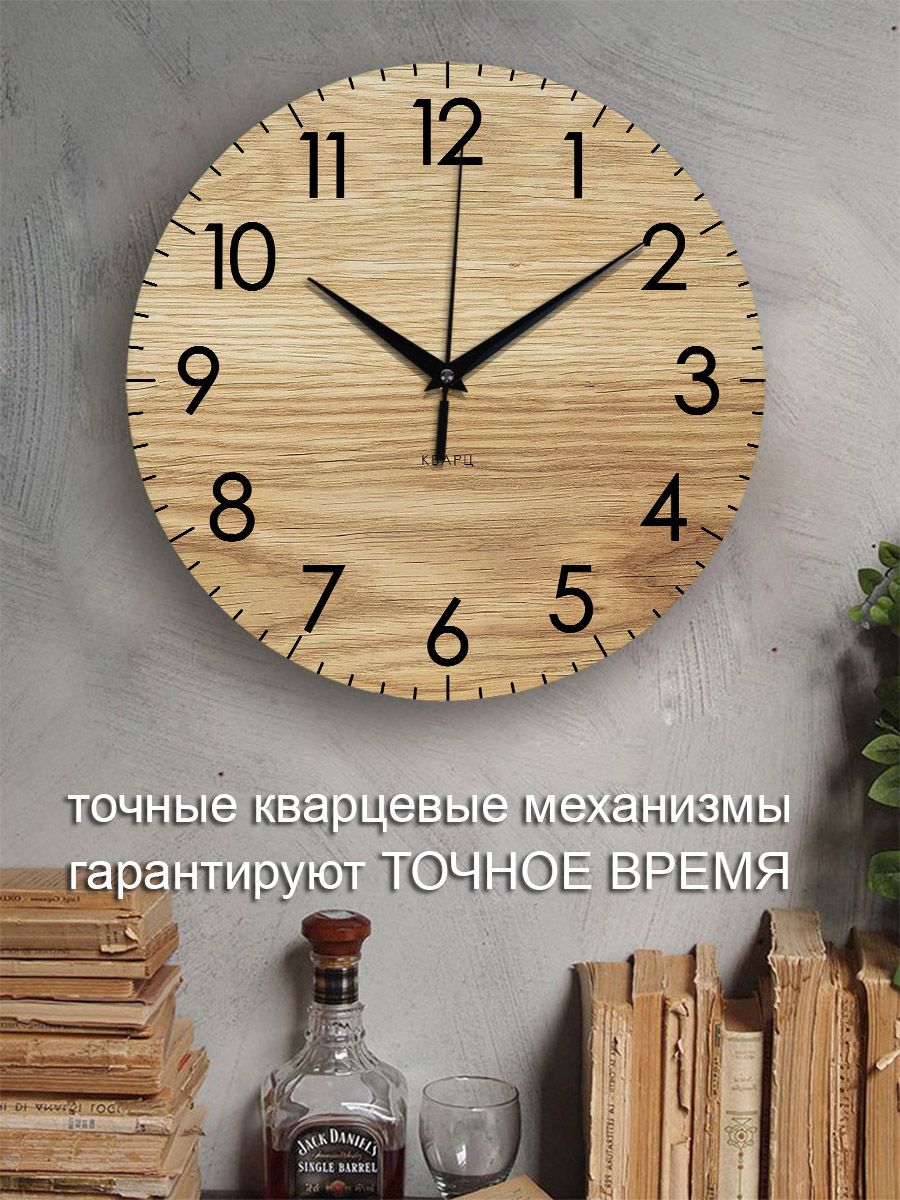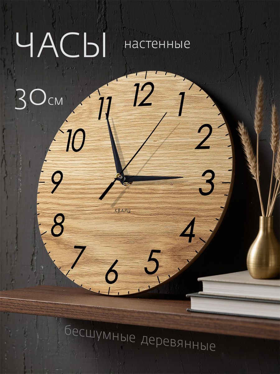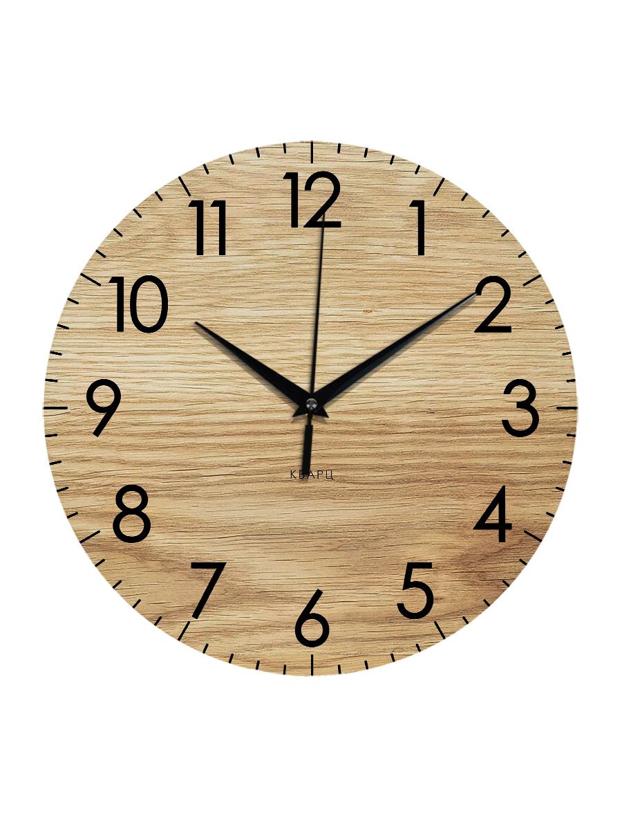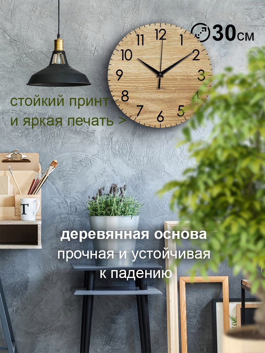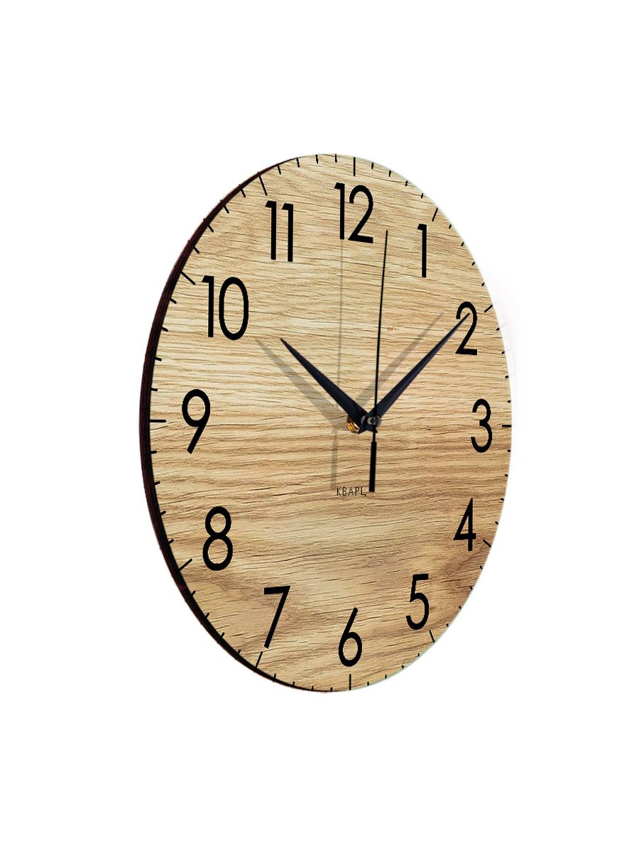 Эти настенные часы из МДФ с принтом гарантирующий одинаковую текстуру шпона дуба станут стильным акцентом в любом интерьере. Диаметр 30 см — оптимальный размер для кухни, спальни, гостиной или офиса и дачи. Основание выполнено из МДФ, кашированным принтом дуба, что придаёт часам фактуру и благородный оттенок настоящего дерева.