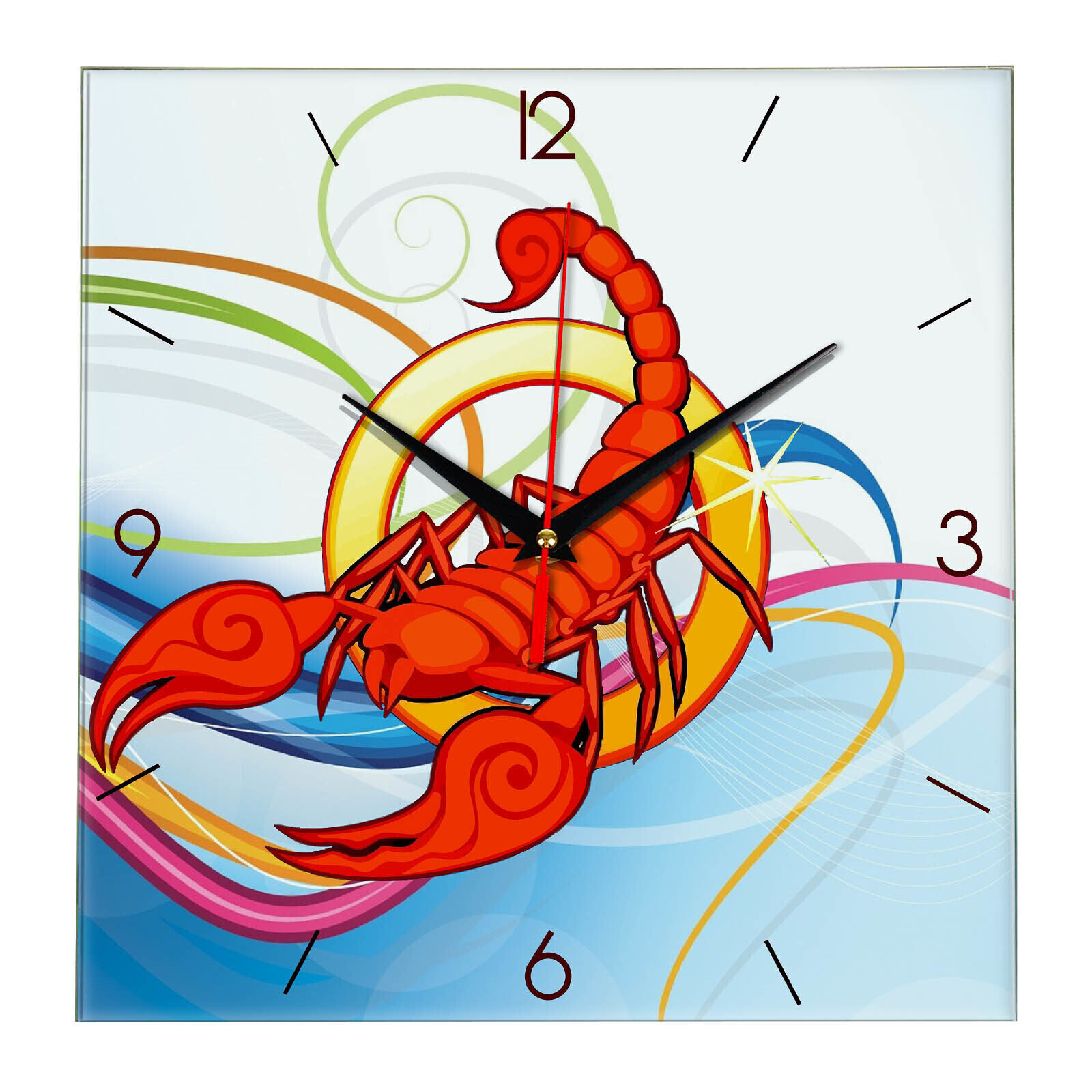Часы настенные "Знаки зодиака" Скорпион. Прекрасно подходят в качестве сувенира или подарка. Размер часов именем 28х28 см, стекло 4 мм, изображение ULTRA HD качества. Оно нанесено с обратной стороны. Стекло дает глубокий оптический эффект и защиту от выгорания ярких цветов. Механизм кварцевый с плавным ходом работает от пальчиковой батарейки АА. Стекло закалено и покрыто с обратной стороны защитной пленкой для защиты изображения и для безопасности. Упаковка из белого гофрокартона с дополнительными элементами для сохранности стеклянного циферблата. Размер упаковки: 0,3х0,3х0,04 м , масса 0,8 кг.
