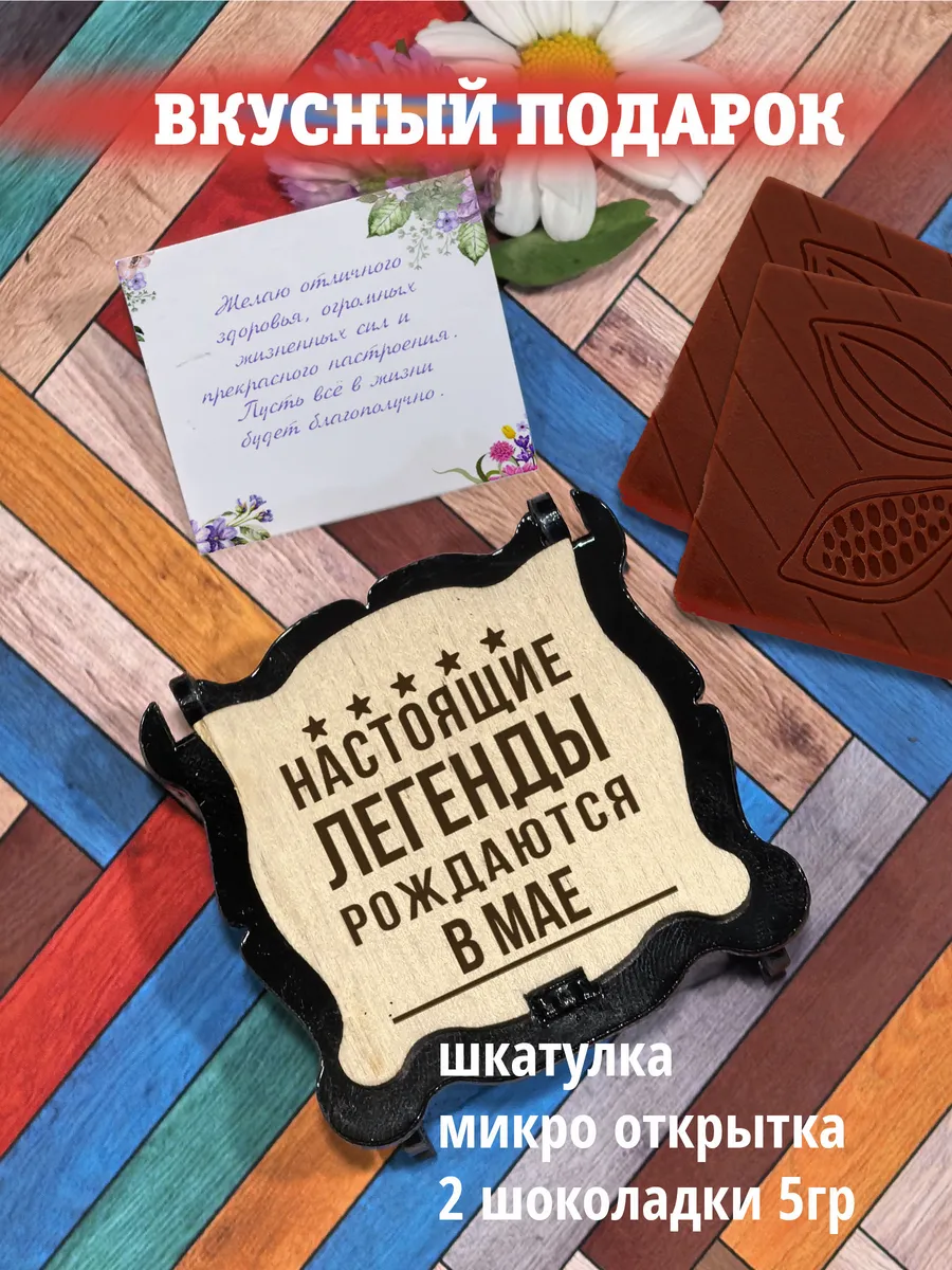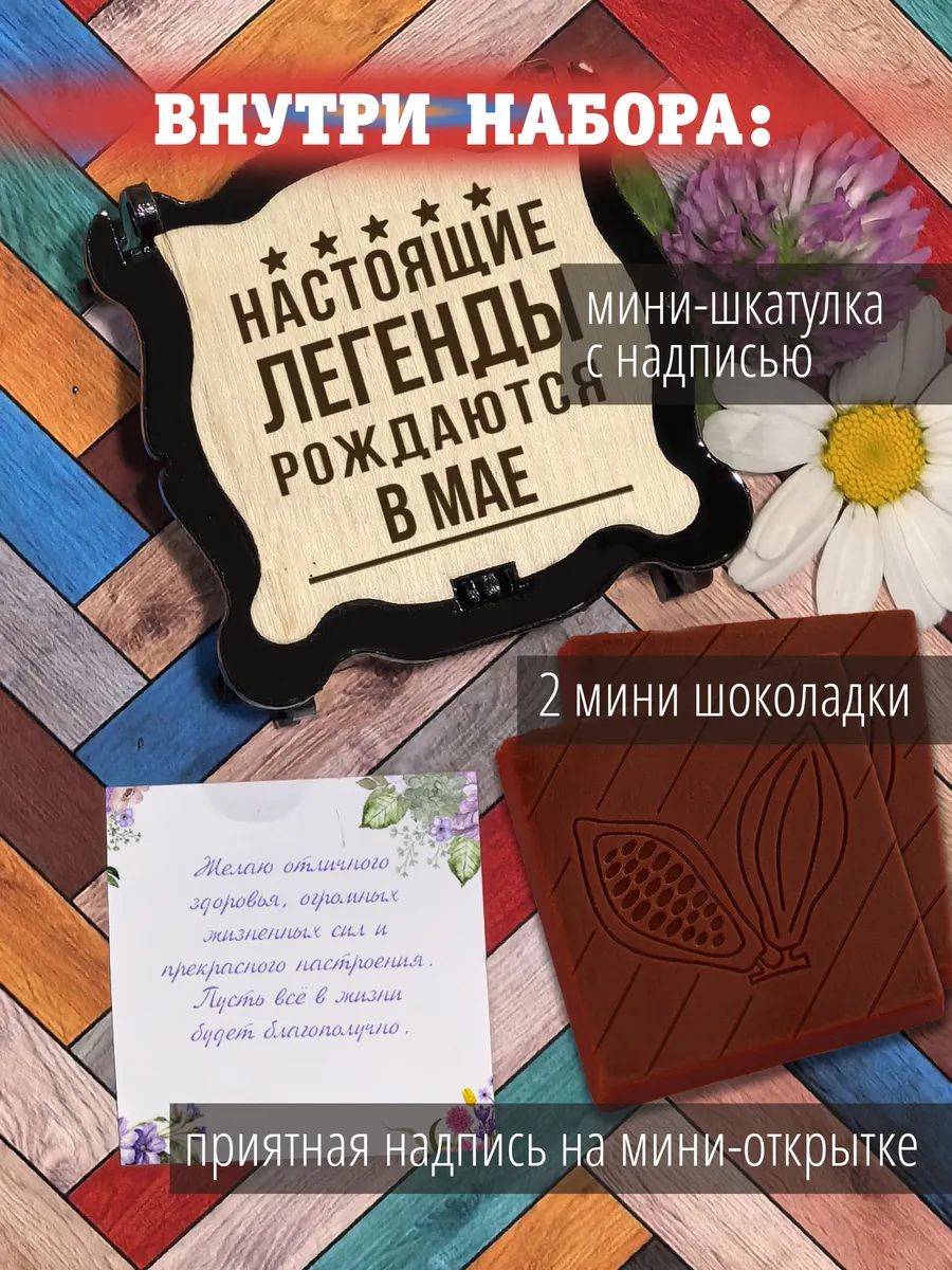 Если ты ищешь необычный подарок мужчине, то наш подарочный набор "Настоящие легенды рождаются в мае" - именно то, что тебе нужно! Набор шоколада с открыткой в оригинальной подарочной упаковке это сюрприз бокс со сладостями и шкатулка для украшений, который 100% подарит незабываемые эмоции! Шкатулку можно применить как конверт для денег и украшений (кольцо, браслет, цепочка). Вам больше не нужно ломать голову над тем какой сделать подарок для женщины. В комплекте ты найдешь набор молочного шоколада в изысканной индивидуальной упаковке с приколами, которые будут весело удивлять и поднимать настроение каждый день. Яркий и красочный набор- это необычный и оригинальный сладкий подарок в виде вкусняшек, который подарит незабываемые эмоции и впечатления всем близким, родным, друзьям и коллегам. Сюрприз бокс состоит из 2 плиток вкуснейшего молочного шоколада по 5 г с признаниями и пожеланиями для всех. Каждая плитка завернута в индивидуальную упаковку, которую удобно брать с собой в дорогу. Но это еще не все - наш подарочный набор сладостей также можно использовать, как конверт для денег и юмористическую открытку, которые подойдут как подарок к юбилею, так и подарок женщине либо подарок сестре, подарок подруге или подарок бабушке. Не упусти возможность порадовать своих близких знаком внимания и приобрети наш подарочный бокс со сладкими наборами прямо сейчас. Наш подарочный набор -это идеальный подарок для любимого человека в любой день - ко дню рождения, как знак внимания. Внутри бокса box 2 мини плитки вкуснейшей еды из молочного шоколада по 5 г с пожеланиями. Сделай свой подарок особенным, заказав наш вкусный и веселый подарочный набор сейчас!