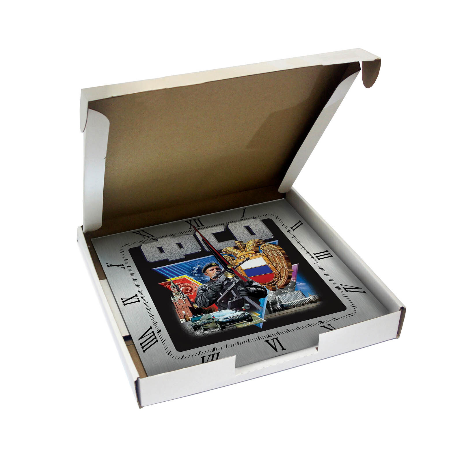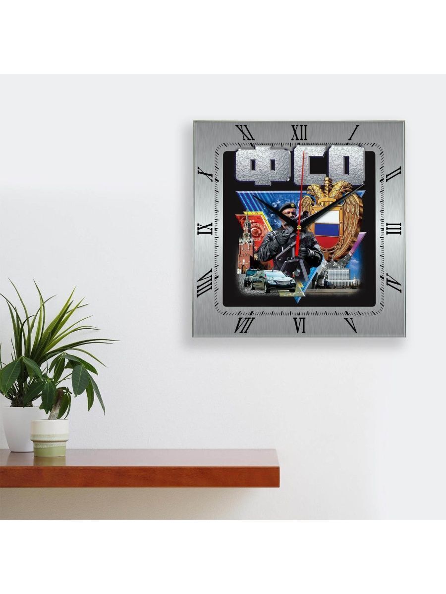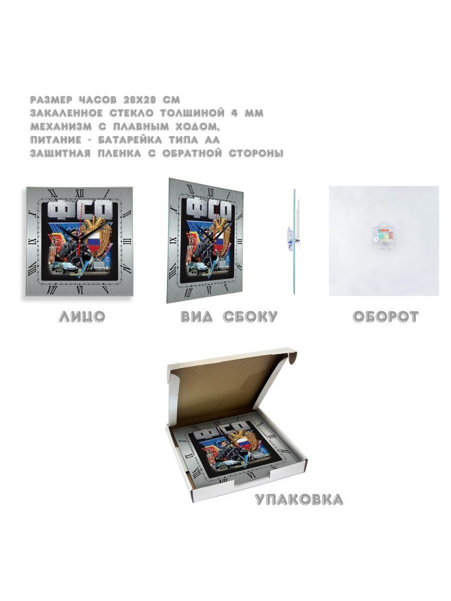 Самые крутые часы с символикой ФСО ждут Вас! В наличии множество моделей с символикой и достопримечательностями. Выбирайте идеальные часы себе уже сейчас! Характеристики: стекло марки М1 толщиной 4 мм. Стандартные размеры: 280х280 мм, механизм бесшумный работает от батарейки типа АА.