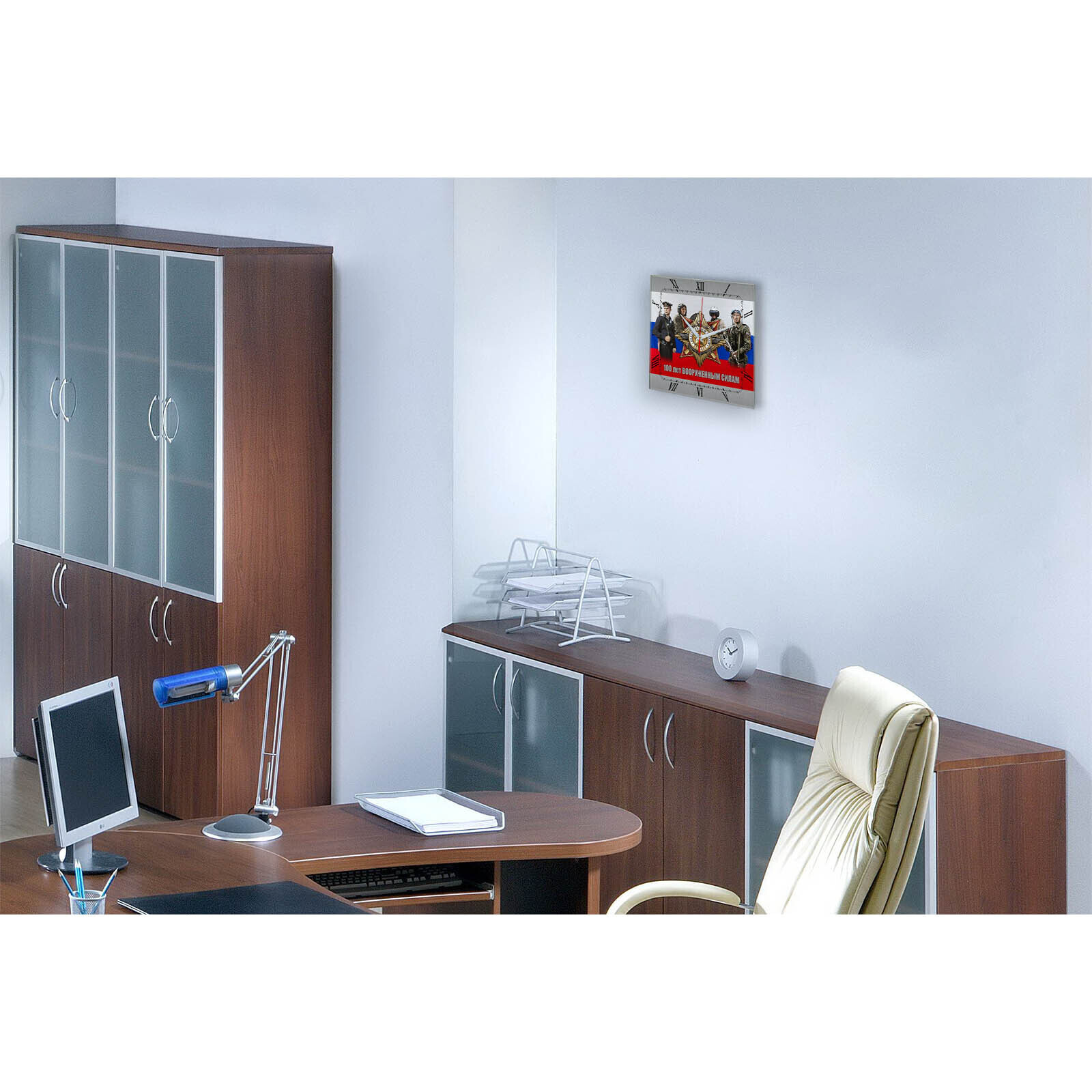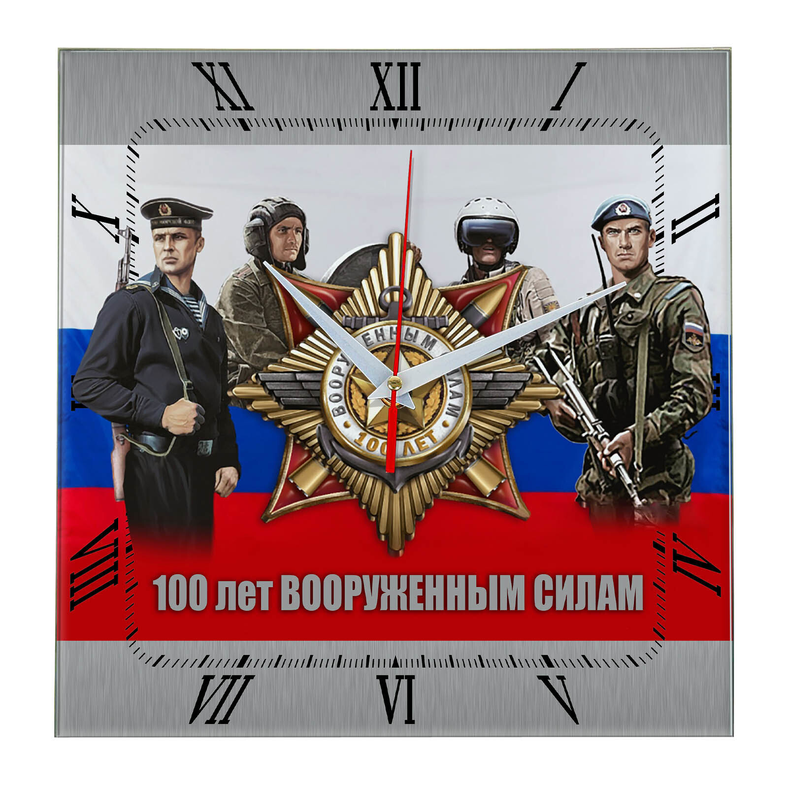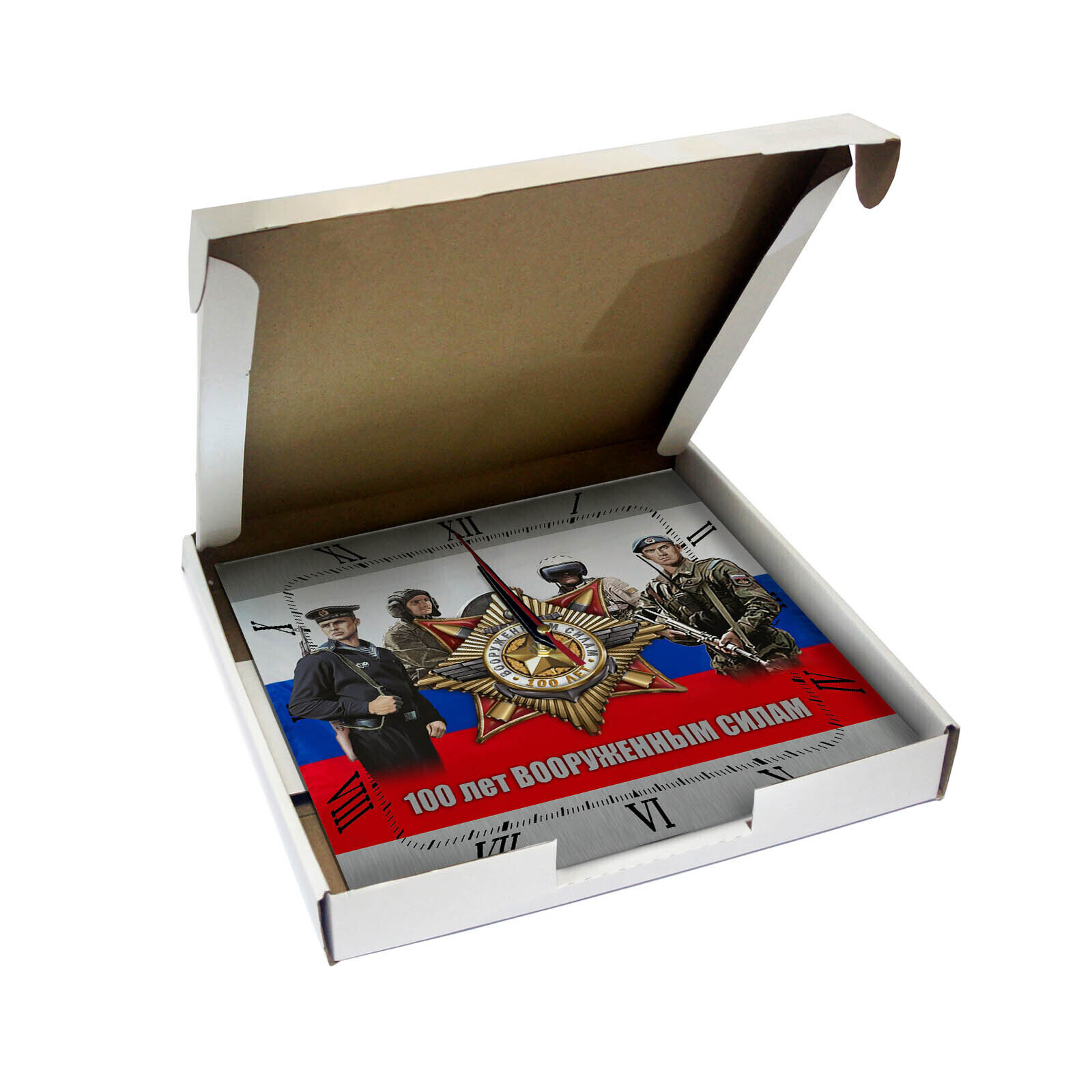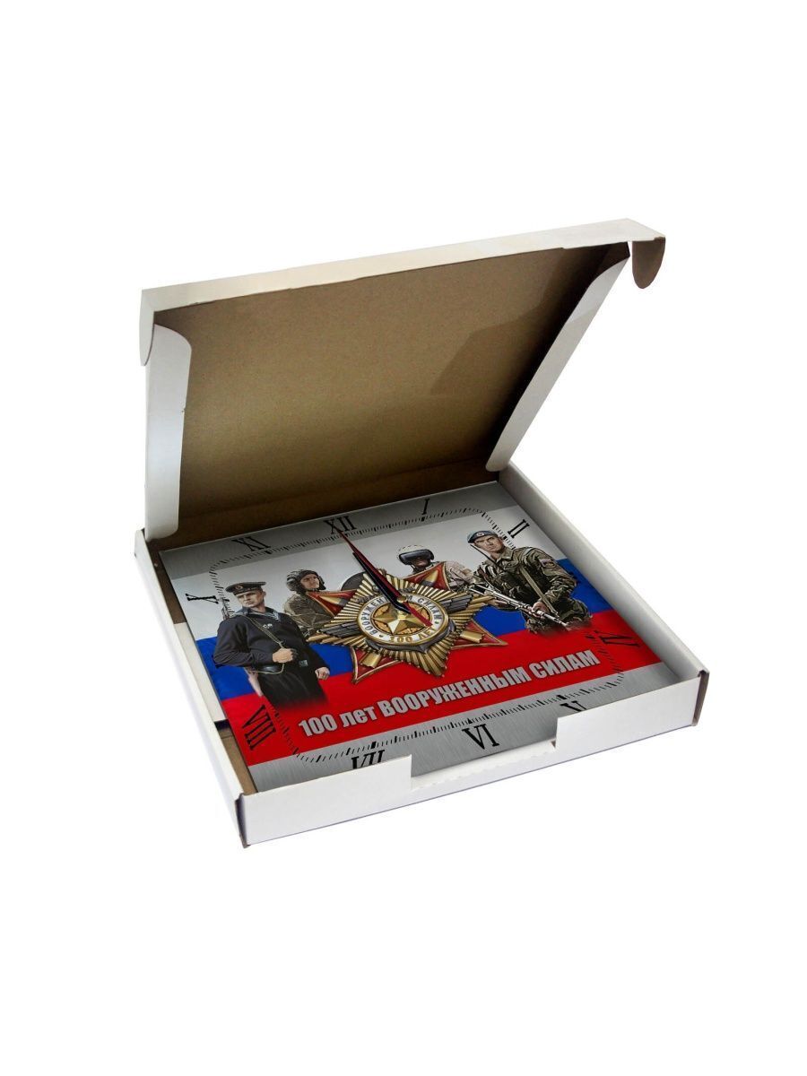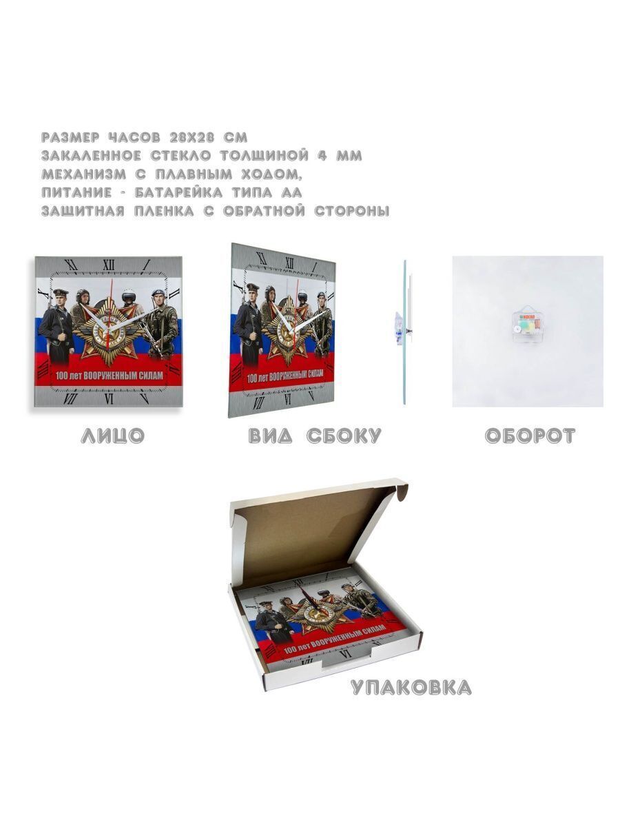 Сувенир и подарок часы rosgvardiya 11 размер часов с именем 28х28 см, стекло 4 мм, изображение печатаем ULTRA HD качества. Оно нанесено с обратной стороны. Стекло дает глубокий оптический эффект и защиту от выгорания ярких цветов. Механизм кварцевый с плавным ходом работает от пальчиковой батарейки АА. Стекло закалено и покрыто с обратной стороны защитной пленкой для защиты изображения и для безопасности. Упаковка из белого гофрокартона с дополнительными элементами для сохранности стеклянного циферблата. Размер упаковки: 0,3х0,3х0,04 м , масса 0,8 кг.