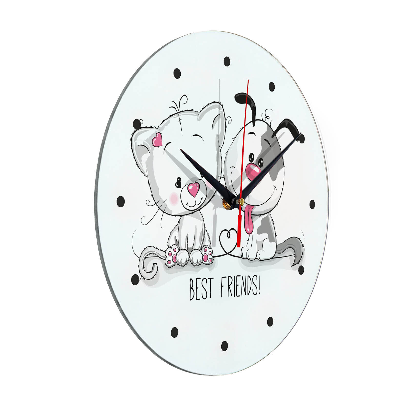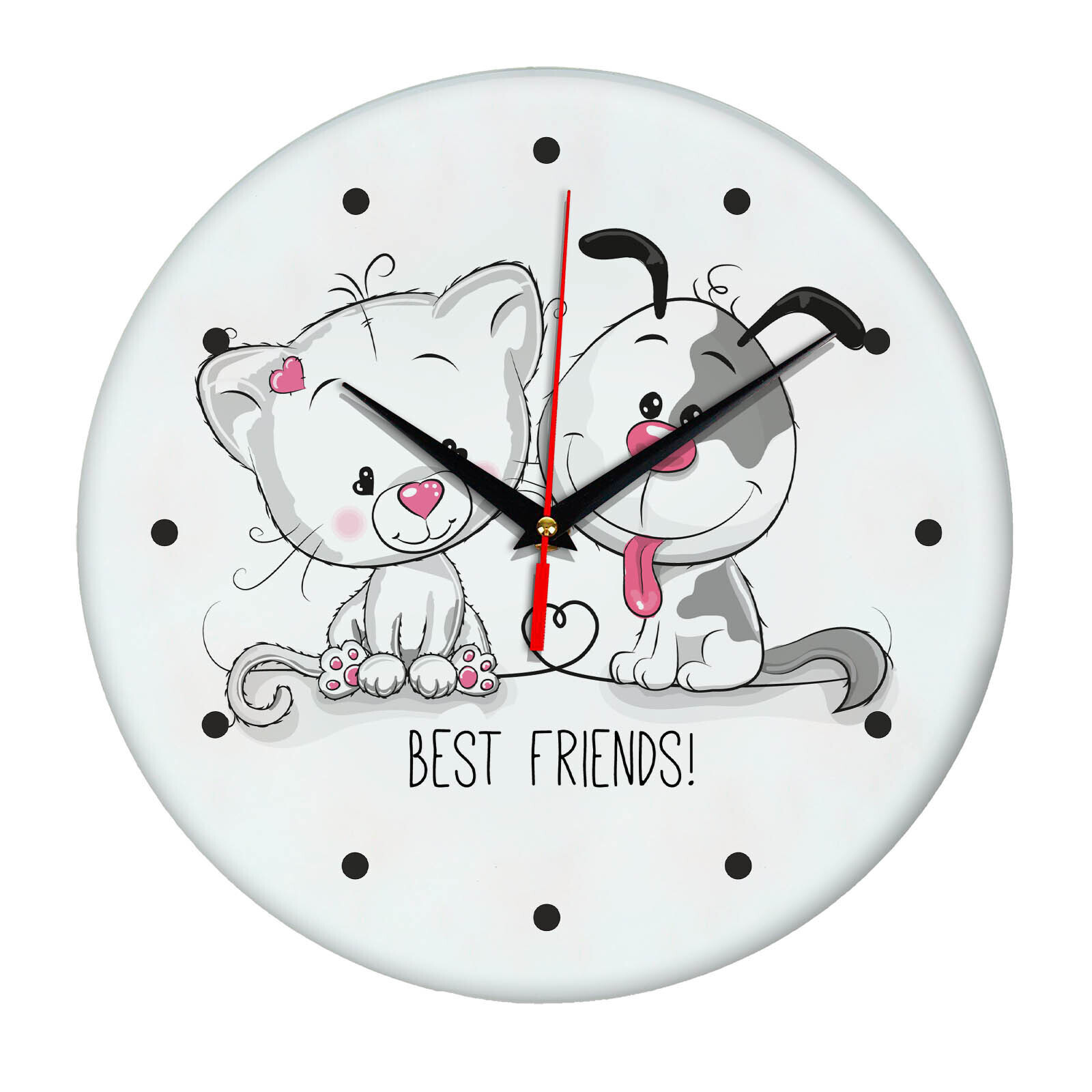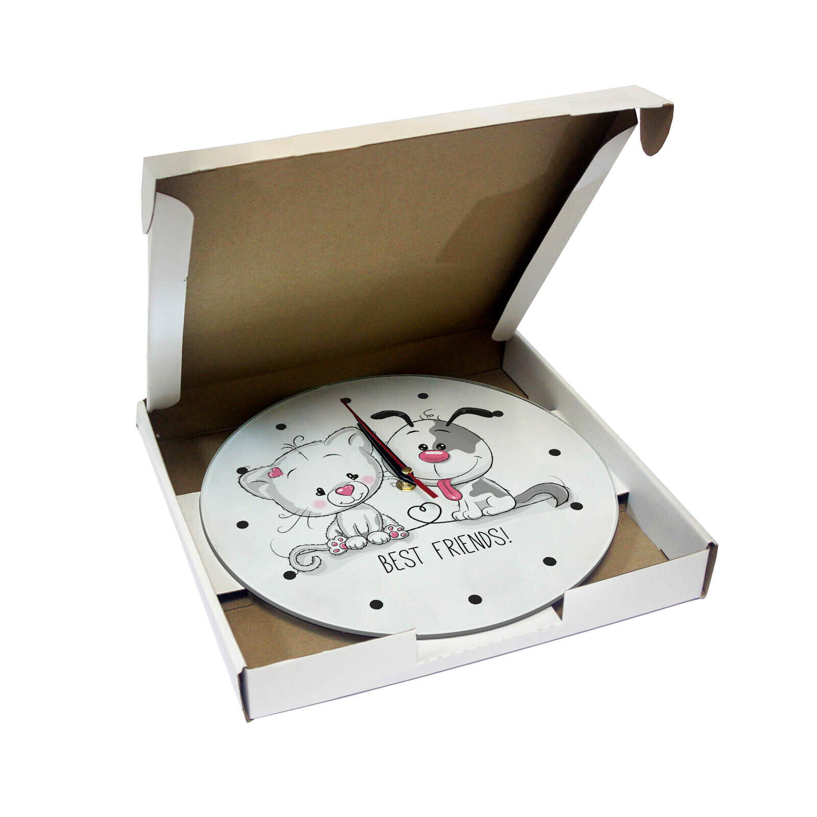 Сувенир и подарок часы "Кот и собака - лучшие друзья" размер часов с именем 28х28 см, стекло 4 мм, изображение печатаем ULTRA HD качества. Оно нанесено с обратной стороны. Стекло дает глубокий оптический эффект и защиту от выгорания ярких цветов. Механизм кварцевый с плавным ходом работает от пальчиковой батарейки АА. Стекло закалено и покрыто с обратной стороны защитной пленкой для защиты изображения и для безопасности. Часы послужат отличным подарком на любой праздник - 23 февраля, 8 марта, новоселье, юбилей, Новый год - жене, мужу, бабушке, дедушке, брату, коллеге, другу. Упаковка из белого гофрокартона с дополнительными элементами для сохранности стеклянного циферблата. Размер упаковки: 0,3х0,3х0,04 м , масса 0,8 кг.